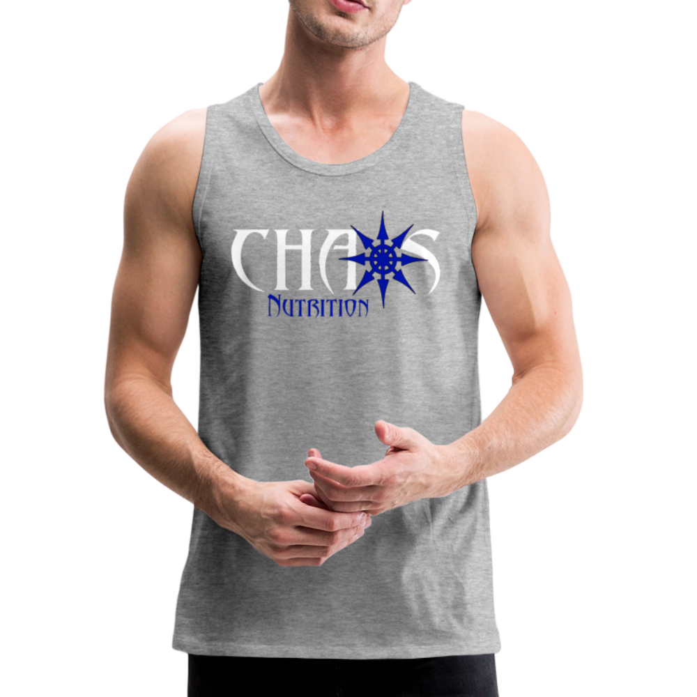 CHAOS NUTRITION, Black Tank Top with Blue- White Lettering - heather gray