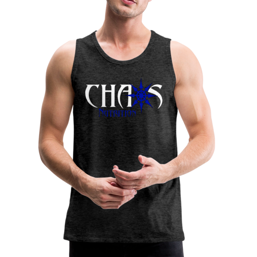 CHAOS NUTRITION, Black Tank Top with Blue- White Lettering - charcoal gray