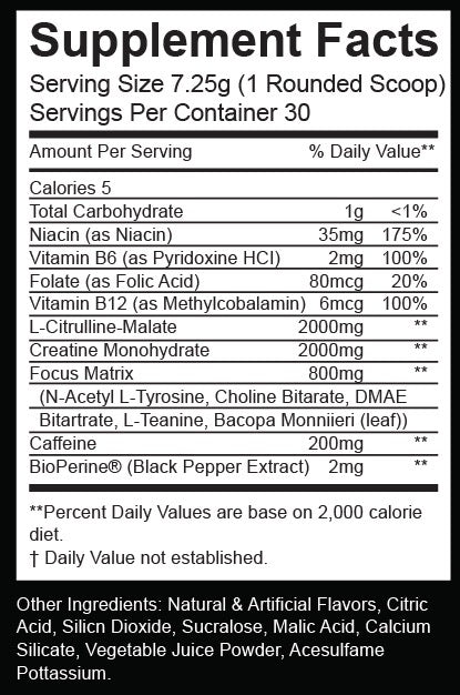 Caffeine- (200mg) – turbocharges your central nervous system and ignites your mind and muscles to rapid action. Caffeine is raw, pure energy, and the 200mg dose is more than enough to get most anyone's engine revving!